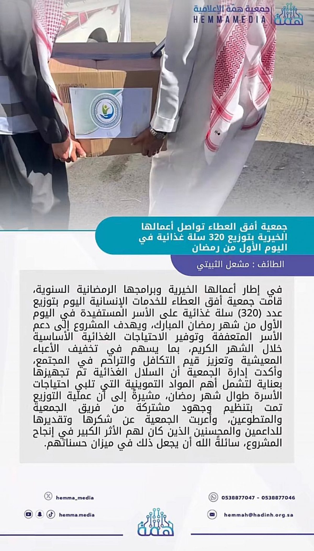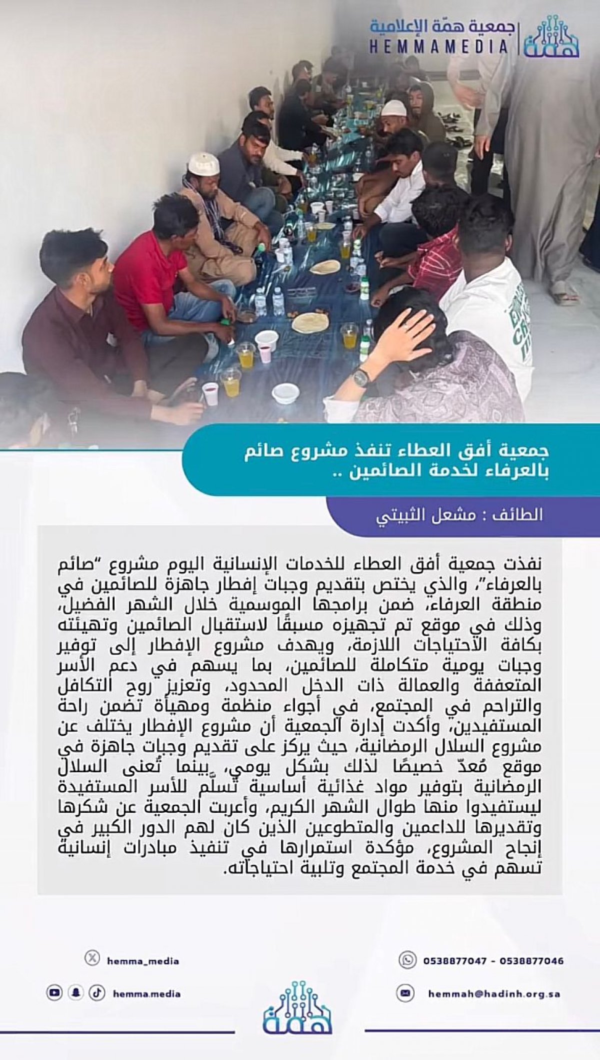 جمعية أفق العطاء للخدمات الإنسانية بالعرفاء هي منظمة خيرية غير ربحية تسعى إلى تعزيز وتحسين الخدمات الخيرية والتنموية والتطوعية تأسست بتاريخ 06 /11 /1445 وذلك في تطوير نطاقها الإداري من خلال برامج ومشروعات وأنشطة نوعية والعمل على تحويل الأسر المستفيدة من الرعاية الاجتماعية إلى التنمية الاجتماعية توفير القيادات اللازمة بالتدريب والتأهيل والاستقطاب وبناء الصف الثاني مع تفعيل مختلف أدوارها وتقديم خدمات اجتماعية وتنموية خيرية متميزة من خلال برامج و شراكات متنوعة تهدف لتمكين المستفدين وتوفير حياة كريمة ومجتمع حيوي واعي .